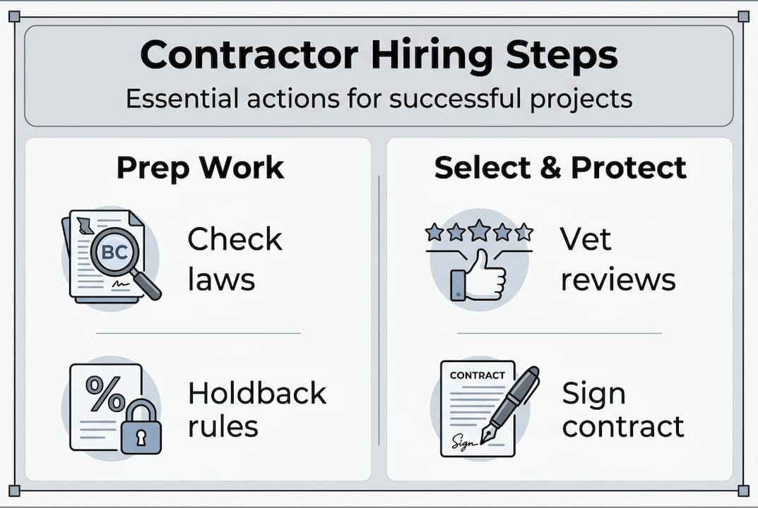 Hiring the wrong contractor in Metro Vancouver can cost you far more than money. Disputes, unfinished work, and legal complications from unpaid subcontractors are real risks that property owners and business operators face every year. BC's construction laws add another layer of complexity that out-of-province contractors and inexperienced local firms often mishandle. This guide walks you through every critical step, from understanding your legal protections before breaking ground to resolving disputes after the job is done. Whether you're planning a tenant improvement, a warehouse renovation, or a residential build, these steps will help you hire with confidence and protect your investment.
