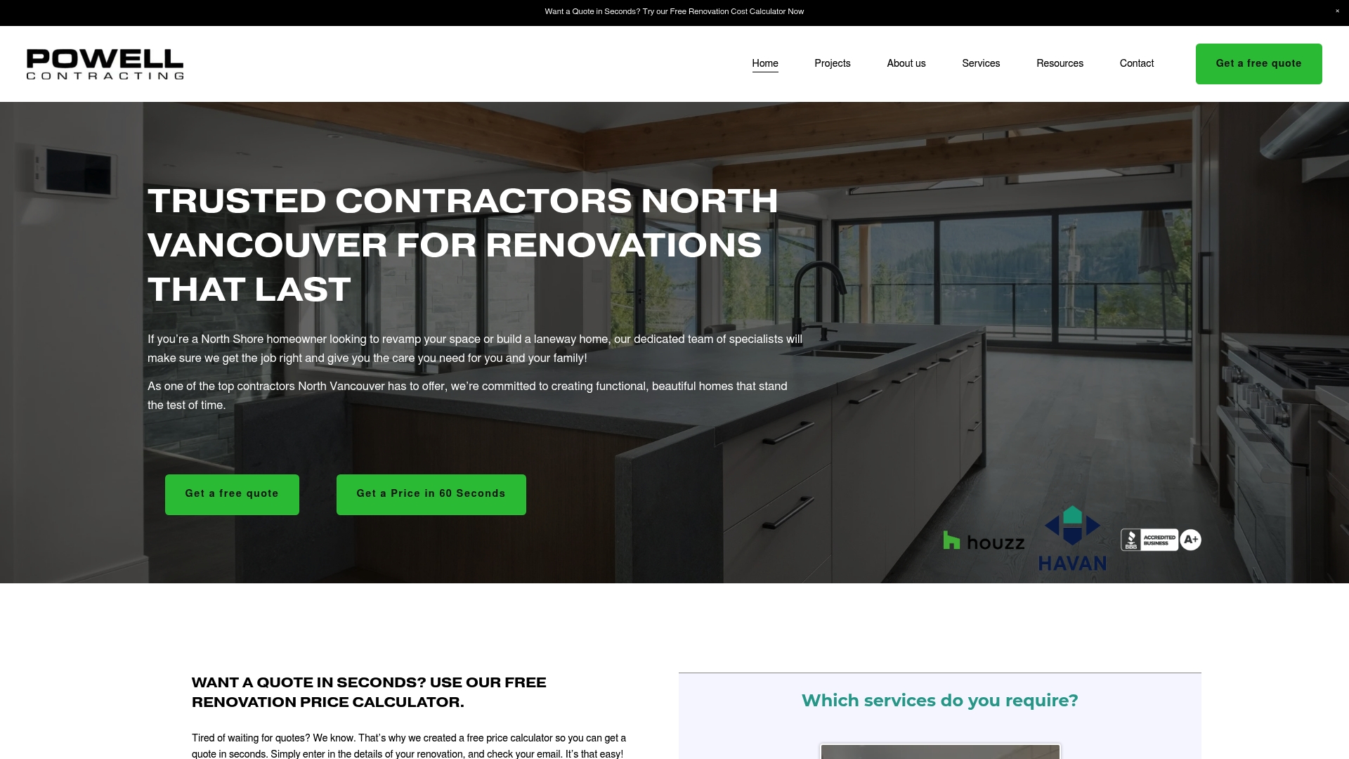 Powell offers full service renovations and custom builds, staffed with an in house HVAC and plumbing team and dedicated project managers who provide biweekly updates. They provide fast, transparent estimates using an online renovation price calculator and back work with warranties of 10 years for new builds and 2 years for renovations.