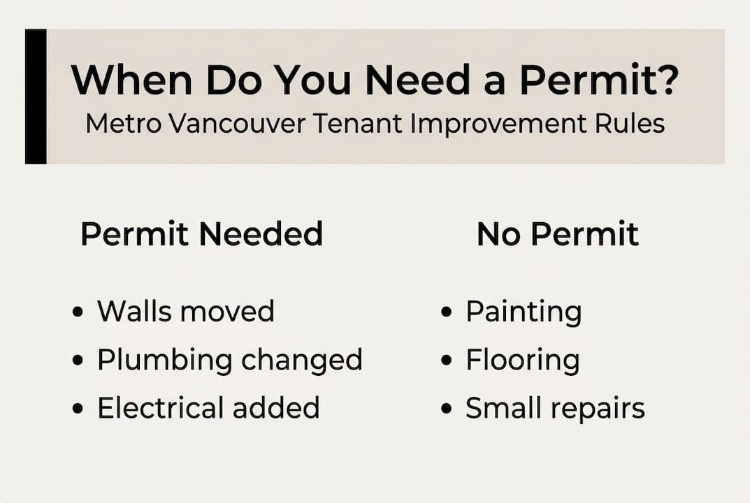 - Most tenant improvements in Metro Vancouver require permits, especially for structural or mechanical work.